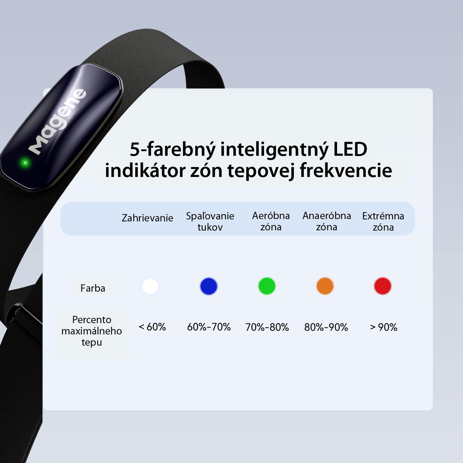 Farebný LED pás na prednej strane pásu vizuálne zobrazuje, v akej zóne srdcovej frekvencie sa aktuálne nachádzate – bez potreby sledovania displeja.