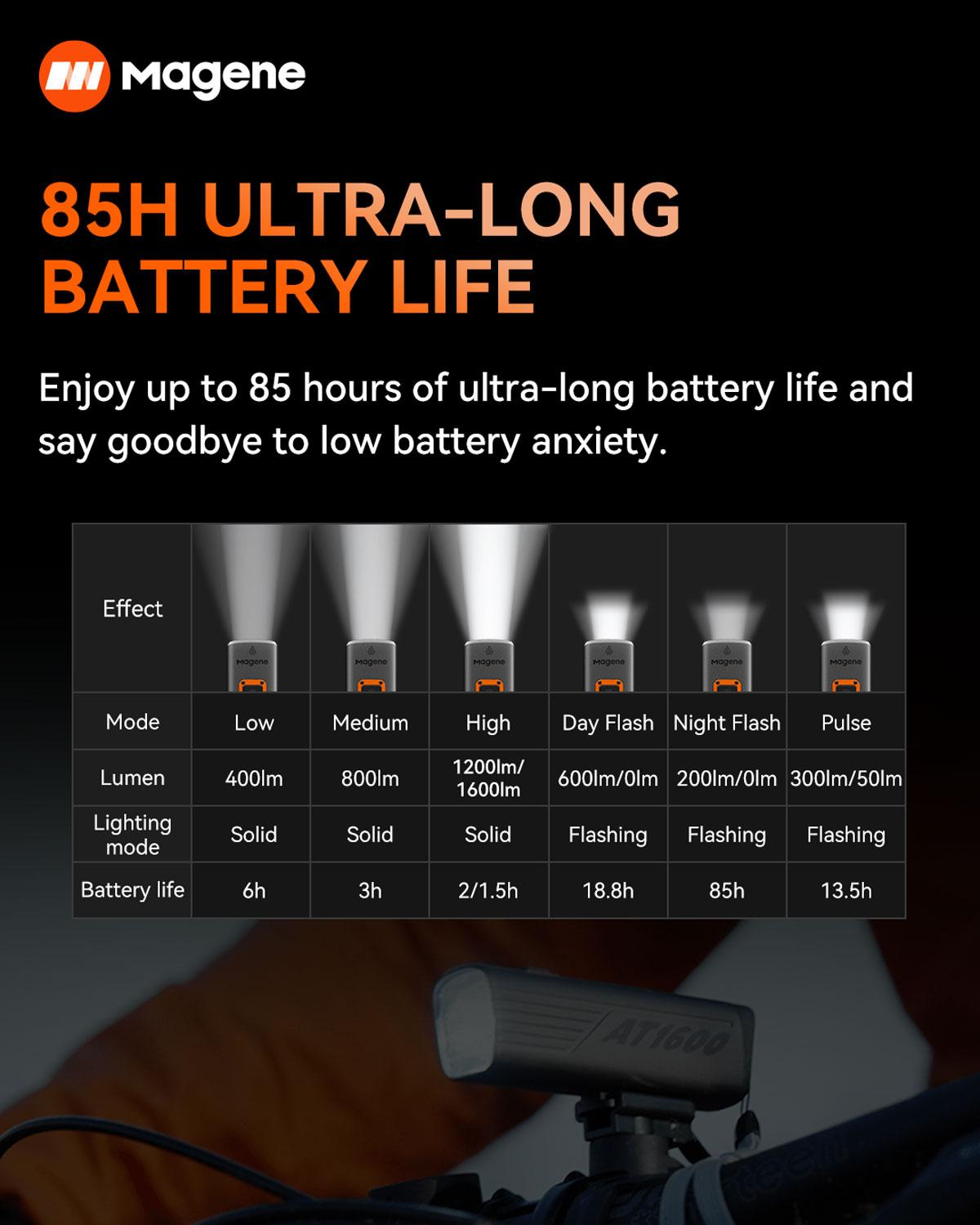 Rýchle nabitie za 2,5 hodiny pomocou USB-C a dlhá výdrž batérie robia zo svetla MAGENE AT1200 spoľahlivého spoločníka na každú jazdu!