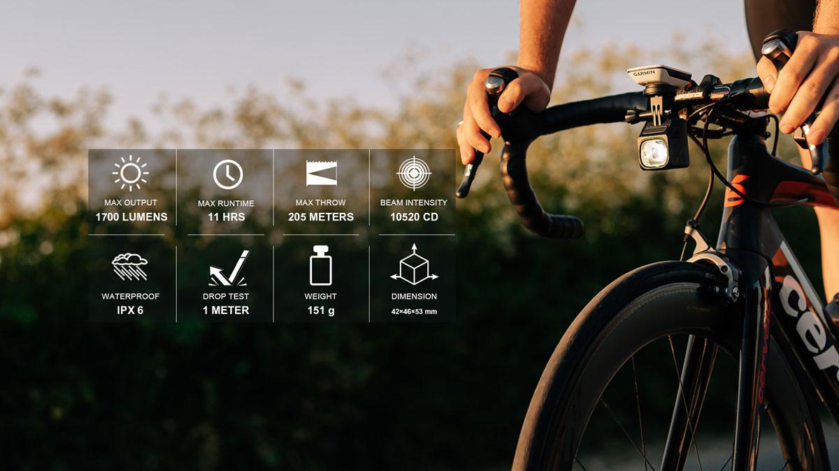 Max výkon: 1700 lm; Intenzita lúča: 10520CD; Batéria: 3.6V 4000 mAh; Max prevádzkový čas: 11 hod; Max dosah svetelného lúča: 205 m; Doba nabíjania: 5 hod (5V 1A); Nabíjačka: USB-C; Vodeodolnosť: IPX6; Rozmery: 42x46x53 mm; Váha: 151 g;
