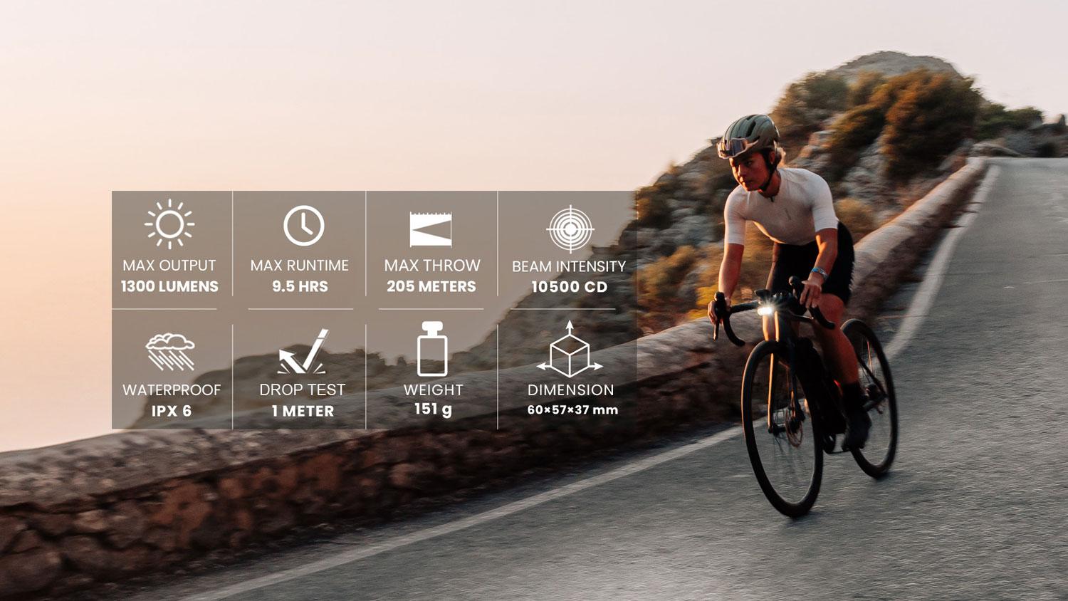 HORI 1300 je moderné cyklistické svetlo s inovatívnym horizontálnym dizajnom, vysokým výkonom a inteligentnými funkciami – ideálne pre mestské dochádzanie, cestnú aj gravel cyklistiku.