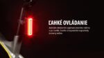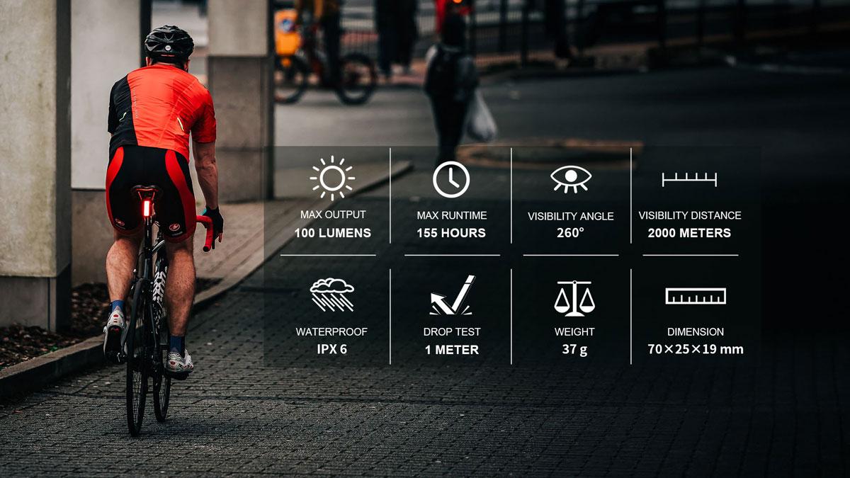 Max výkon: 100 lm; Max. prevádzkový čas: 12 hod; Viditeľnosť: 260°; Vzdialenosť: 2000 m; Nabíjačka: micro USB; Vodeodolnosť: IPX6; Systém upevnenia: popruh, úchop na sedlo; Rozmery: 27x17x73 mm; Váha: 36 g