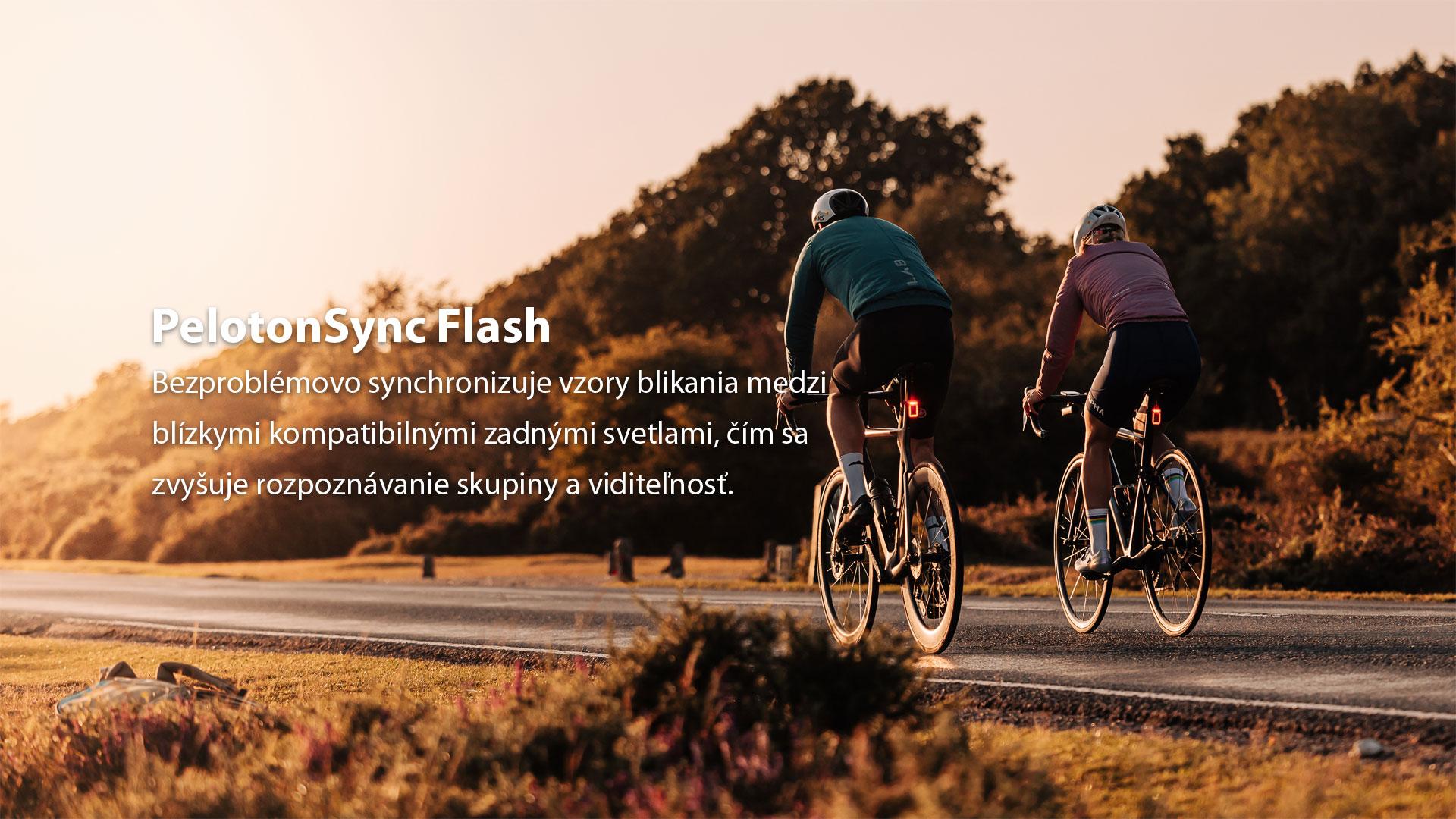 Technológia PelotonSync Flash inovuje koncept synchronizovaného skupinového blikania a zaisťuje, že pri jazde v pelotóne s kompatibilnými zadnými svetlami sa vzory blikania automaticky synchronizujú. Táto funkcia posilňuje nielen súdržnosť, ale zlepšuje aj celkovú viditeľnosť na ceste.
