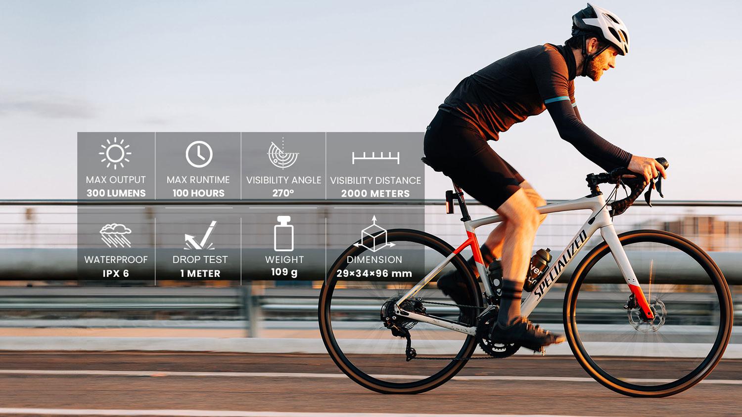 SEEMEE R300 je robustná jednotka s výkonnou 3350mAh batériou, ktorá ponúka až 100 hodín prevádzky. Režim eco-flash predlžuje životnosť batérie bez ohrozenia bezpečnosti. Indikátor batérie umožňuje rýchlu kontrolu stavu batérie. Taktiež obsahuje bezpečnostný zámok, ktorý zabraňuje náhodnej aktivácii. Zariadenie je vodotesné IPX6, čo zaisťuje spoľahlivosť za každého počasia. Uchopenie je riešené všestranným štvrťotáčkovým držiakom, ktorý možno bezpečne uchytiť na rôzne typy sedloviek, čo z neho robí spoľahlivého a univerzálneho spoločníka.