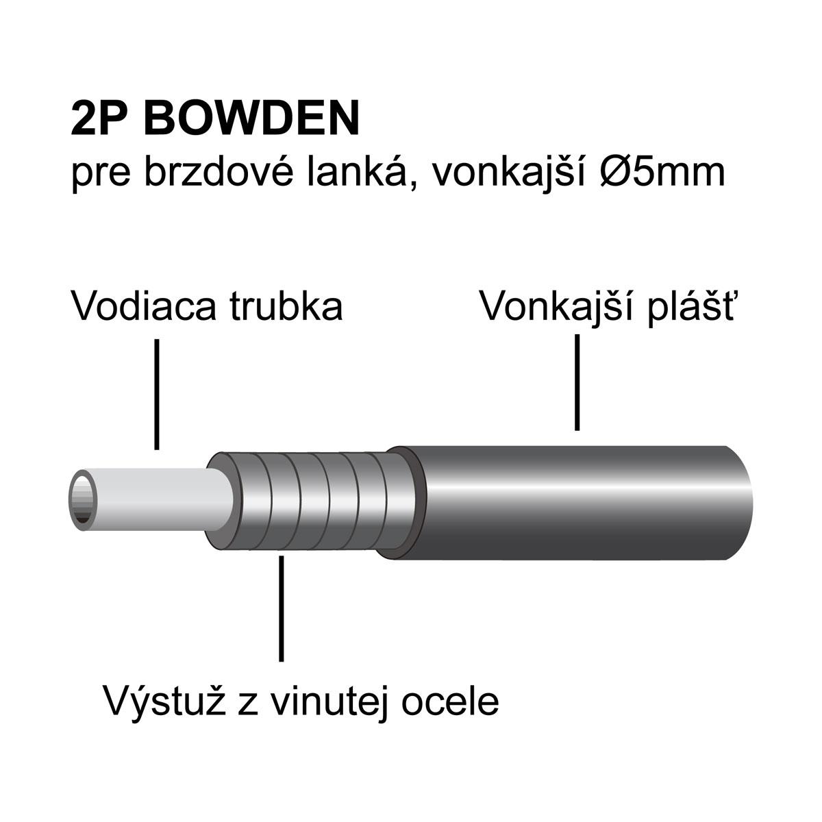 Bowden 2P pre brzdové lanká s teflónovou povrchovou úpravou vnútorného vedenia. Nízke vnútorné trenie znižuje silu potrebnú na brzdenie. Vonkajší priemer 5mm. Balenie 50m v balíku.