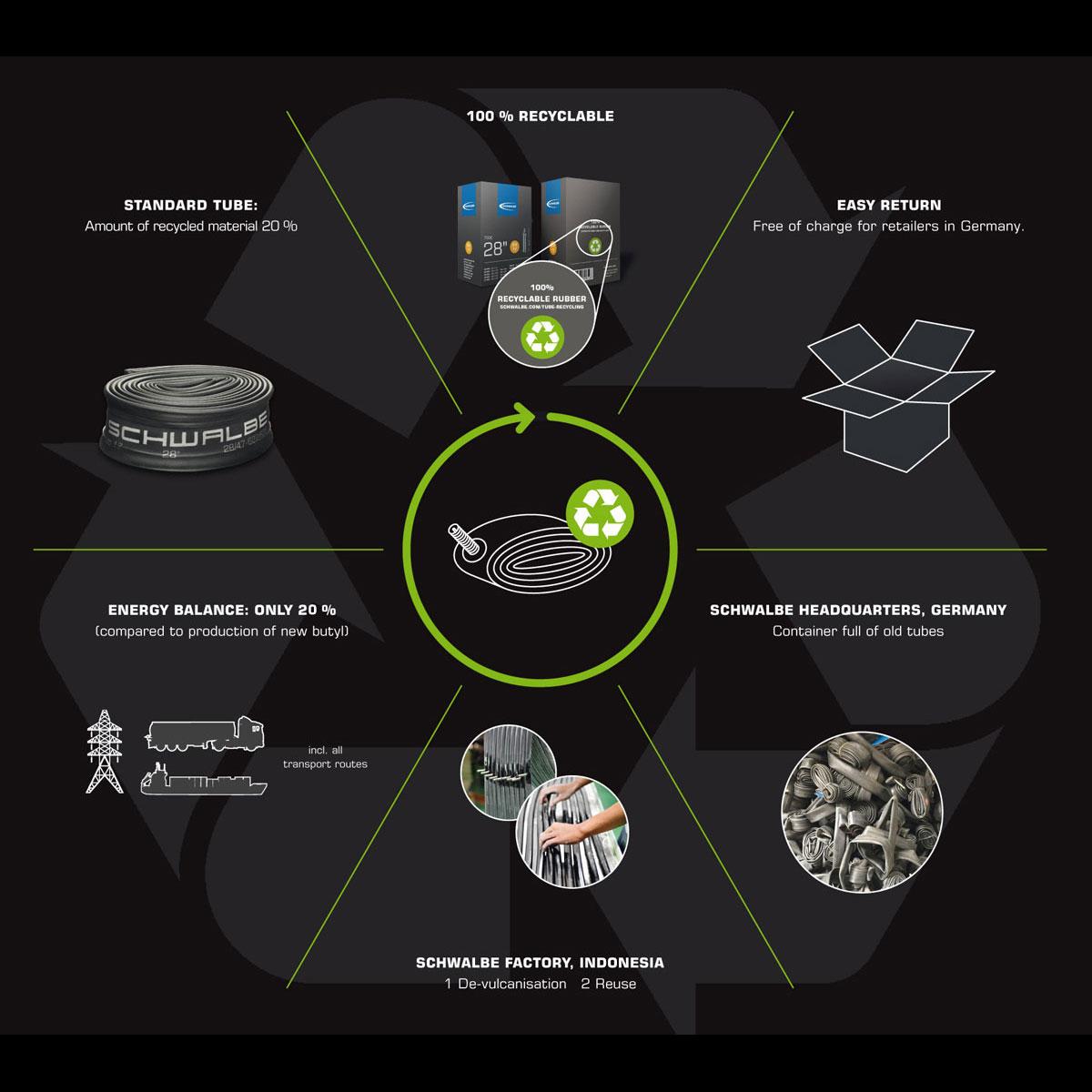 Každá duša Schwalbe je 100% recyklovateľná. Bez straty kvality môžeme pri výrobe nových duší použiť recyklovaný materiál. V našej továrni sme vyvinuli špeciálny proces devulkanizácie a už niekoľko rokov sa ukazuje, že veľmi úspešné. Aktuálne každá štandardná duša od Schwalbe pozostáva z 20% z recyklovaných starých duší.