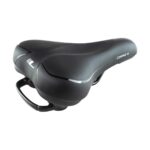Komfortné sedlo COMUT-E je konštrukčne predurčené pre pohodlnú jazdu v mestských podmienkach a ľahkom teréne. Absolútny komfort zabezpečujú dva nezávislé pružiace systémy. Redukcia nárazového tlaku sedla a absorbcia nárazov sedla na sedacie kosti je zabezpečená umiestnením vrstvy pamäťovej peny, ktorá rozkladá tlak na väčšiu plochu a prispôsobuje sa tvaru tela. Pod ňou umiestnená vrstva peny s vyššou hustotou zabezpečuje tlmenie vibrácií a zvyšuje stabilitu. Znížený stredový pás a stredový otvor redukuje tlak v oblasti medzi sedacími kosťami a zvyšuje odvetranie. Druhý systém je umiestnený pod sedlom, kde väčšinu vibrácií od kolesa zachytí vnútorná vinutá pružina a zostatok vonkajší elastomer. Elastomer prekrýva pružinu, takže sa nemusíte báť zacvikvutia prstov alebo predmetov v pružine. Súčasťou pružiaceho systému je aj madlo, ktoré umožňuje pohodlné ochopenie bicykla. Odolný zvršok zabraňuje pokĺznutiu na sedle počas jazdy. Pevné oceľové koľajničky zvyšujú životnosť sedla.